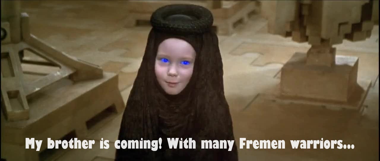 In the book, Chani still helps revive Paul from his coma, but the prophecy doesn’t require her. Whereas now, when Lady Jessica uses the Bene Gessirit Voice to force Chani to give her tears to Paul—something the Fremen would never do, as it wastes water—in order to wake him, and all in accordance to the Lisan al-Gaib prophecy, Chani becomes complicit in the Sleeper Awakening. She is now a crucial piece in the rising of the Kwisatz Haderach. She is now directly responsible for the terrible future of war and death and suffering that not only awaits her people, but many others all across the galaxy as well. To paraphrase that one guy: “She has become death, the destroyer of worlds.”
