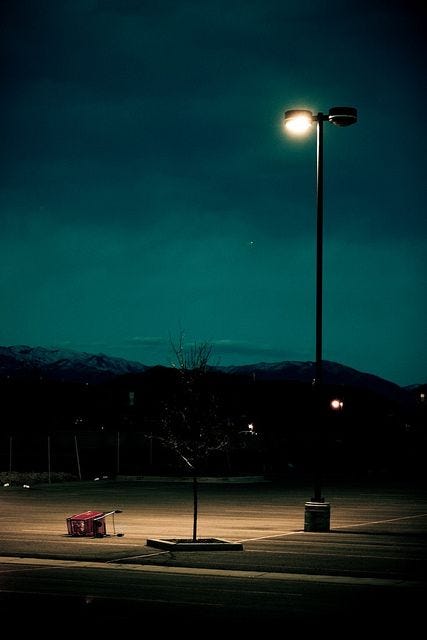 They turned to see Ted, the assistant manager, standing in the bright rectangle of the store’s entrance. He cupped his hands to his face. “Don’t forget that cart!” and gestured toward the far end of the lot.